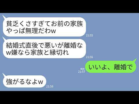 LINEで【LINE】うちを貧乏人と見下すエリート夫が結婚式が終わった途端に離婚宣告「お前の家族やっぱ無理w結婚続けたきゃ縁切れ」→お望み通りに離婚し永遠に無視したら夫が終わったwww出てくると思わなかったわ