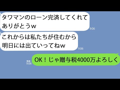 【LINE】タワマンのローンを全額返済した途端義姉夫婦がやってきて…「返済終われば用無しだから出てけw」私「じゃ贈与税4000万よろしくね?」義姉「え?」って動画が話題らしいぞ