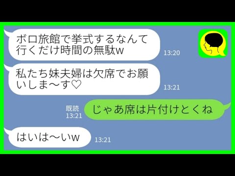 【LINE】一流企業を退職して実家のボロ旅館を継いだ私の夫を見下して結婚式をドタキャンする妹夫婦「貧乏旅館で挙げる式とか時間の無駄w」私「じゃあ席は片付けとくね」→そのまま出禁リストに載せた結果wwwって動画が話題らしいぞ