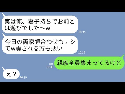 【LINE】両家顔合わせ当日に婚約者から連絡「実は俺、妻子持ちでした〜wキャンセルで」私「親族皆集まってるよ」→1時間後、嘘つき男が全てを失うことにwww