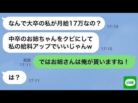 【LINE】両親に溺愛され姉を見下す妹が職場にコネ入社「中卒の姉はクビでw」次期社長「では俺が貰います!」妹「は?」→社長の息子の邸宅に姉が招待された結果…