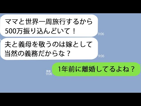 【LINE】久々に連絡してきた元夫「ママと世界一周旅行するから500万ちょうだいw嫁なら文句言わず出せよ?」私「もう離婚してるけど」元夫「は?」って動画が話題らしいぞ