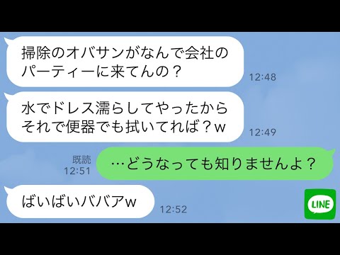 ラインで【LINE】会社の創立記念パーティーで私が社長の妻と知らずバケツの水をかけて追い返したゆとり社員「掃除のババアは帰れw」→本当に帰ったら女のせいで会場が大混乱にwww出てくると思わなかったわ
