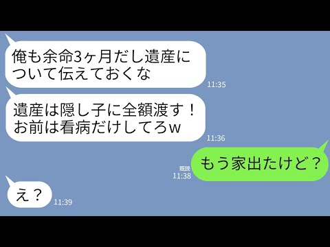 【LINE】余命3ヶ月と診断された夫が衝撃告白「遺産は隠し子に相続する。嫁のお前にやるものはない」私「そう」→速攻で出ていって永遠に連絡絶った結果wって動画が話題らしいぞ