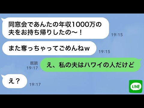 人の彼氏を奪うことを趣味のようにしている同級生のDQN女が、半年前の私が欠席した同窓会で「アンタの旦那をお持ち帰りした」と略奪自慢のLINEをしてきた。どうも旦那の年収が多いことに目をつけたようだけど…。私の旦那、同窓会に行ってないんだよな…