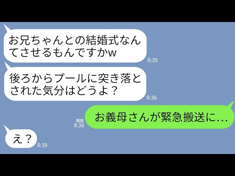 【LINE】兄と結婚した私に嫉妬して披露宴会場のプールに突き落としたブラコン義妹「ずぶ濡れじゃ式中止ねw」→クズ義妹に本当に落とされた人物がまさかのwww