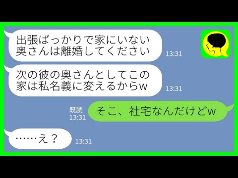LINEで【LINE】出張中に夫の浮気相手が勝手に新妻宣言して新築の高級マンションに住み着いた「この家、私名義に変えるからw」私「そこ社宅なんだけどw」→速攻で追い出した結果www出てくると思わなかったわ