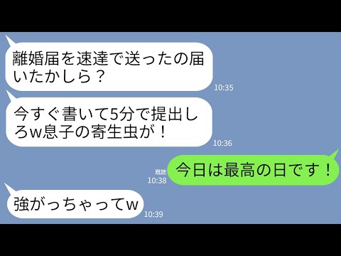 ラインで【LINE】出張中に義母から速達で離婚届が届いた…義母「今すぐサインして提出しろ!年収~寄生虫がw」私「助かります!」→大喜びで名義を夫にし離婚すると夫と義母が半狂乱にwww出てくると思わなかったわ