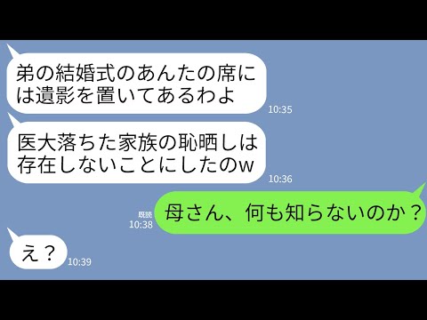 【LINE】医者の弟の結婚式に出席すると私の席に私の遺影が…母「医大落ちたクズは存在しないことにしたw」→弟「何も知らないの?」→母がガクガク震え出した理由が…w