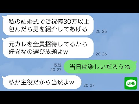 【あらすじ】今まで何度も友人知人から男を奪ってきた幼馴染の結婚式に招待された。もちろん欠席で返信。すると「ご祝儀30万円以上で私の元カレの中から好きなのあげる」と出席を要請された。なんと過去に捨ててきた元カレ全員も招待しているという。それ大丈夫なの…?