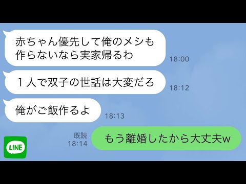 ラインで【LINE】双子の出産後に俺の飯がないと言って実家に帰った夫「俺がご飯作るよ」→ダメ夫に離婚を告げると手のひら返ししてきて…w【スカッと修羅場】出てくると思わなかったわ
