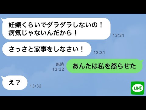 【LINE】妊娠8ヵ月の気弱な嫁をなめてこき使う姑「妊婦は病気じゃないから働け!」→全てを知った家族から“ある事実”を告げられた義母の反応が笑えるwって動画が話題らしいぞ