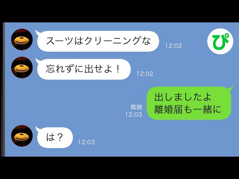 【LINE】妻の私を奴隷扱いし、スーツを投げつけた亭主関白夫「クリーニングに出しとけ!」→なぜかポケットに入っていた記入済の離婚届も出しておいた結果w【スカッと修羅場】