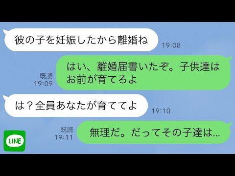【LINE】嫁「17歳年下の彼氏の子を妊娠したから離婚して」夫「はい離婚届。子供達はお前が育てろ」嫁「は?全員あなたが育てて」夫「無理、だってその子達は…」【スカッとする話】