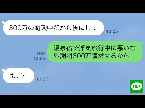 【あらすじ】半年前から嫁の出張が増えたのだが、あることをきっかけに出張は浮気旅行であると突き止めた。こちらの動きに気づかず浮気に夢中な嫁が、また出張と言う名の浮気旅行へ。俺からのLINEを「今は商談中」と突っぱねる彼女に、慰謝料の話を振ってみると…w