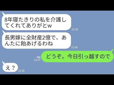 LINEで【LINE】寝たきりの義母を同居介護して8年の私に義母「長男嫁に全財産2億は相続させるw次男嫁のあんたは飴ちゃんどうぞw」→私「どうぞ。今日で新居に引っ越すので」義母「え?」出てくると思わなかったわ