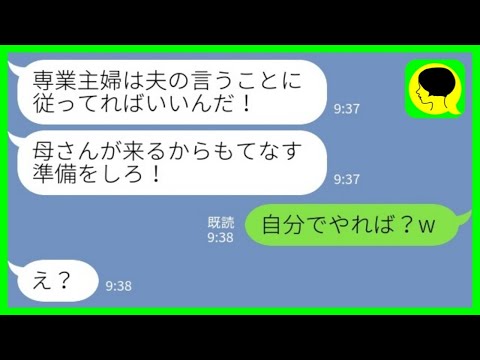 【LINE】専業主婦で従順な私を見下す夫「母さんが来るからおもてなしの準備をしろ!」私「自分でやれば?w」→夫の末路が…