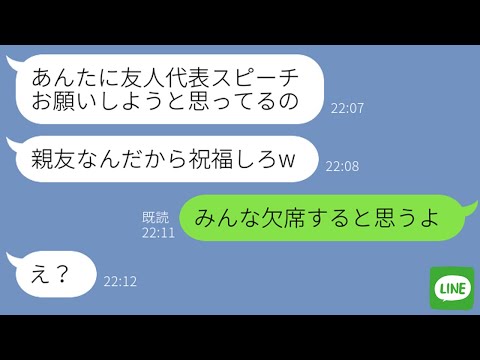 【LINE】彼氏を奪った友人の結婚式を欠席連絡したら「親友なんだから祝福しろ」→人でなし扱いする婚約者の末路が自業自得すぎるwって動画が話題らしいぞ