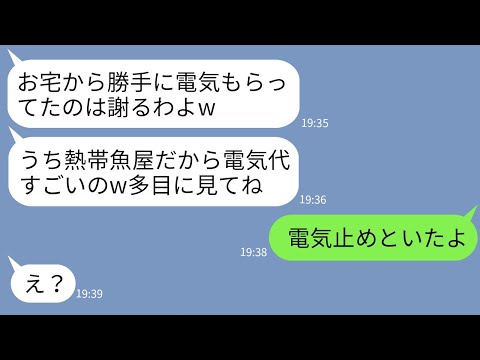 LINEで【LINE】急に電気代が毎月5万になった我が家。隣の熱帯魚店経営のママ友が盗んでいたと判明「電気代かかるから助かるw」→頭に来て電気止めたら女の店が大惨事にwww出てくると思わなかったわ