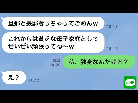 大学時代の友人がいきなり「あんたの旦那奪っちゃったw豪邸から出て行け!」と略奪宣言。そして、「義両親の遺産を全てもらう」「貧乏な母子家庭かわいそうw」と散々コケにしてきた…。しかし彼女はとんでもない勘違いをしているので“衝撃の真実”を教えてあげた結果w