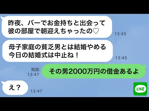 LINEで【LINE】母子家庭の俺を見下し酔った勢いで結婚式をドタキャンした新婦→金持ち男に乗り換えた浮気女に“ある事実”を伝えた時の反応がwww出てくると思わなかったわ