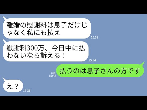 ラインで【LINE】浮気を理由に離婚した元夫の母からブチギレ連絡。元義母「私も傷ついたし慰謝料もらう!300万今日中に振り込め」→私「払うのは息子さんの方です」元義母「え?」出てくると思わなかったわ