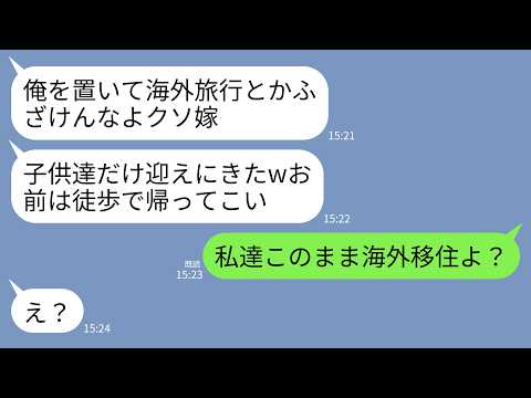 LINEで【LINE】海外旅行から戻った私と子供達を空港に迎えにきた夫「子供達だけ乗せてくwお前は6時間歩いて帰ってこいw」→「え?私達はこのまま海外移住だけど」→実は離婚届出して家も売却済みと知った夫が…w出てくると思わなかったわ