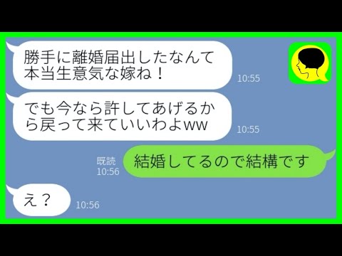 ラインで【LINE】温厚な嫁を見下し浮気夫の肩を持ち離婚届を叩きつけた姑「社長令嬢と再婚させるわw」→その後、逆玉失敗で復縁を迫る義母に〇〇を告げた時の反応が…w出てくると思わなかったわ