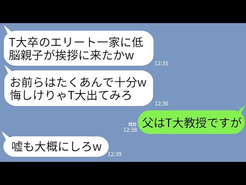 【LINE】父とT大卒一家に結婚挨拶へ行くと婚約者父「T大卒意外は人間じゃないw低脳親子はたくあんで十分w」→私の父がT大教授だと知ってエリート一家が真っ青にwww