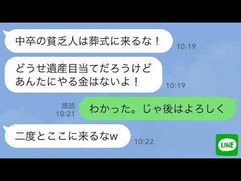 【LINE】父親の葬式で中卒の俺にバケツの水をかけた兄嫁「貧乏人にやる遺産はない!」→お望み通り遺産を受け取らなかった結果…w【スカッとする話】【修羅場】