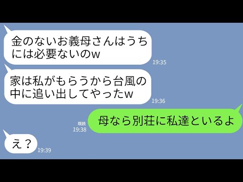 ラインで【LINE】片親で育ててくれた母を台風の夜に追い出し実家を乗っ取った兄嫁「金のないババアはあんたにやるw」→母の別荘で家族みんなで暮らすと伝えた時の反応がwww出てくると思わなかったわ