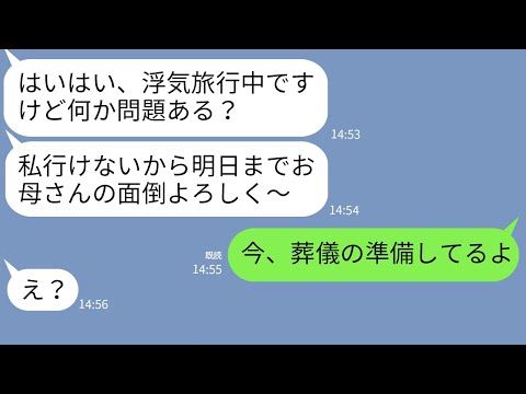 【LINE】病気の母を置いて浮気旅行に行く汚嫁「何か問題でも?w」→開き直るクズ女に衝撃の事実を伝えた時の反応がw