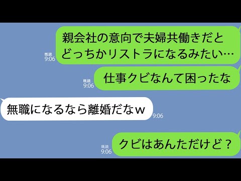 【LINE】私「仕事クビになった」夫「じゃ、離婚ね」→数日後、私ではなく旦那に解雇通知が届いて…w