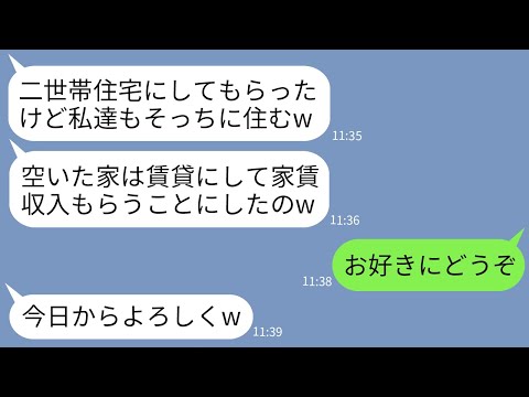 【LINE】私が建てた二世帯住宅の二階を賃貸にして私たち夫婦の一階に勝手に同居する義両親「これで家賃収入ゲットw」→後日、二階に借りに来た人物を見て義両親が顔面蒼白にwww
