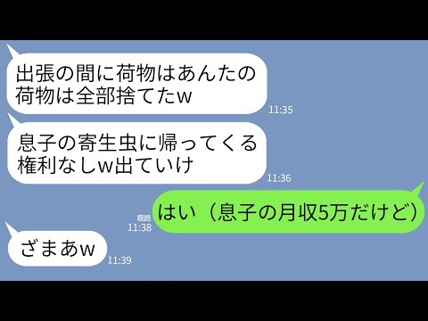 【LINE】私が生活費全額払っていると知らず出張中に荷物を全部捨てた姑「息子の寄生虫が!消えろ!」→私「息子さんの月収知らないのね」→そのまま家を出た結果…w