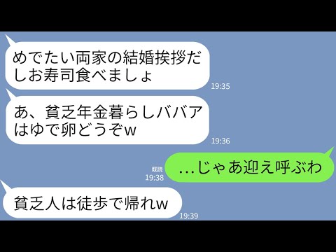 【LINE】私が親代わりに育てた孫の結婚挨拶に行くと私だけゆで卵だった…。婚約者母「年金暮らしババアはそれで十分w」 →呆れた私が高級車でその場を後にしたら地獄の末路がwww