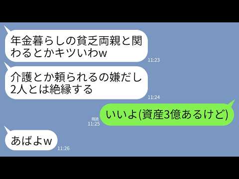 【LINE】私と夫が年金暮らしと知った途端に絶縁宣言する息子夫婦。息子「貧乏人と関わるの無理w」息子嫁「介護イヤだし絶縁でw」→私「いいよ(資産3億あるけど…)」息子夫婦「やったーw」って動画が話題らしいぞ