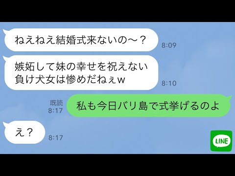 【あらすじ】旦那と離婚したら、妹からの略奪連絡があった。それから1年後に妹と元夫の結婚式の招待状が届くが、当然欠席。それでも妹はとにかく私に幸せマウントをとりたいらしく、結婚式当日にまたLINEしてきたので、実は私も今日が結婚式であると告げ…