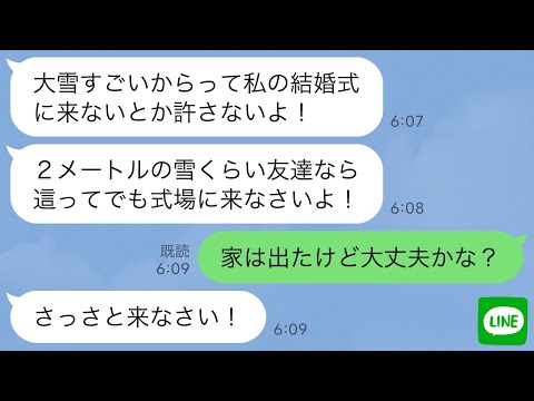 【LINE】積雪2mの大雪の中で結婚式を強行し私達に参列を命令した幼馴染「祝う気あるなら絶対に来いw」→式当日、まさかの事態で慌てる新婦に悲劇が…www