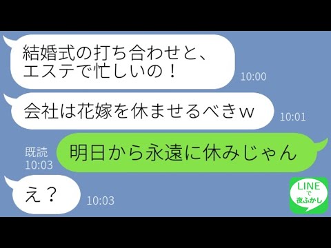 【LINE】結婚が決まった途端脳内お花畑で会社をサボりまくる非常識女「花嫁を休ませる義務があるでしょw」→浮かれるアフォ女が新婚旅行から帰ってくると…w【スカッとする話】