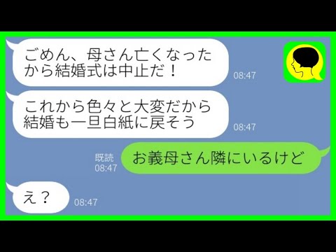 【LINE】結婚式当日、新郎からドタキャン連絡「母さんが亡くなったから中止で」新婦「お義母さん隣にいるけど」→バレバレの嘘をつくアフォ男の末路がwww