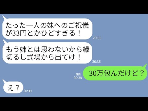 【LINE】結婚式当日、花嫁の妹から怒りの連絡「妹へのご祝儀が33円とか最低!もう縁切るわ!」私「30万包んだけど?」 →式の最中に衝撃の事実を知った妹が震え上がり…wって動画が話題らしいぞ