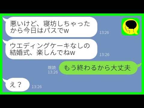 LINEで【LINE】結婚式当日にウェディングケーキ担当の親友が寝坊でドタキャン「今日はパスでw」→非常識女にある事実を伝えた時の反応がwww出てくると思わなかったわ