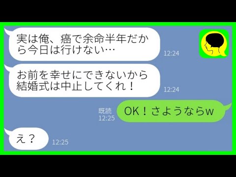 【LINE】結婚式当日に彼氏から突然のドタキャン連絡「俺、余命半年だから…」私「OK!さよならw」新郎「え?」→嘘を見破っていた新婦の怒りの復讐がwwwスカッとするライン動画配信中です!