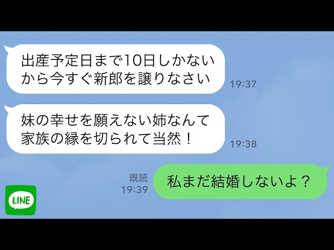 【あらすじ】私が結婚式の準備を進めていると知った妹が「私より先に結婚するな!」と、妨害を宣言。その結婚式当日に、臨月を迎えた妊婦の妹が「新郎の子を妊娠した」と大きなお腹を見せつけて式場へ乱入…と思ったら。その結婚式には、私もお目当ての新郎もいなかった…