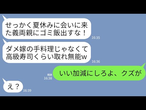 【LINE】義両親が盆休みに突如訪問。私の手料理をゴミ箱に捨てて義父「高級寿司くらい出せ」姑「これだから不妊女は…」→直後、普段は温厚な夫の一言で二人が真っ青にwww