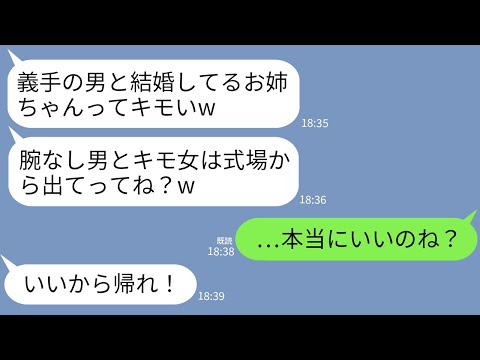 LINEで【LINE】義手の私の夫を見下し結婚式で頭からワインをかけて追い返した妹「私の式に腕なしが来るな!」→ご希望通りに夫婦で帰ったら妹から200件の鬼電が…www出てくると思わなかったわ