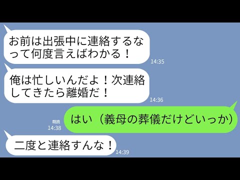 【LINE】義母が亡くなり連絡すると夫がブチ切れ。夫「出張中は連絡するな!バカ嫁が!」私「…わかった」→夫が喪主頼まれてるけど言われた通りに黙ってた結果www