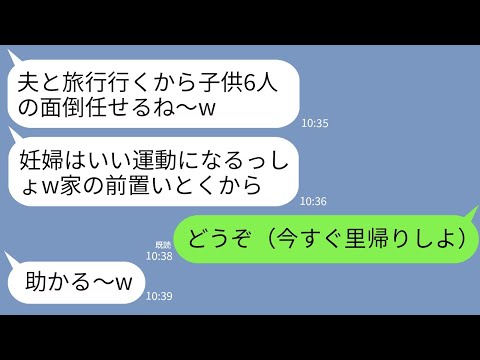 【LINE】臨月の私に子供6人を勝手に預ける自己中義姉「夫婦で旅行だから子供よろしくw家の前置いとく」私「どうぞ」→無視して飛行機で里帰りした結果www