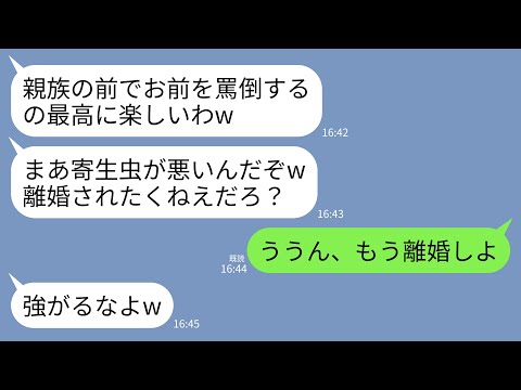 【LINE】親族の集まりで私を見下す夫と義母。夫「俺の金で生きてる寄生虫めw」義母「年収3000万のうちの息子に感謝してw」→私「じゃあ離婚で。はい、これ離婚届」→全員が絶望へw
